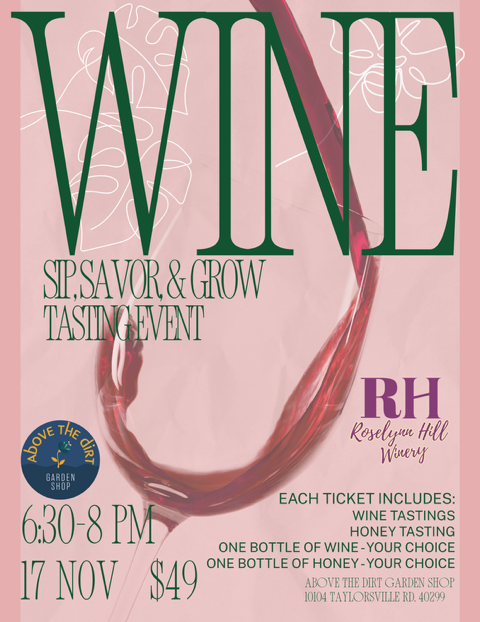 Join us at Above the Dirt Garden Shop for a relaxed and flavorful evening featuring local favorite Roselynn Hill Winery. Enjoy a guided wine tasting, sample a variety of honey, and learn more about what goes into each bottle. Every guest will leave with a bottle of Roselynn Hill wine, a jar of KY Proud honey, and a beautiful houseplant to grow at home.